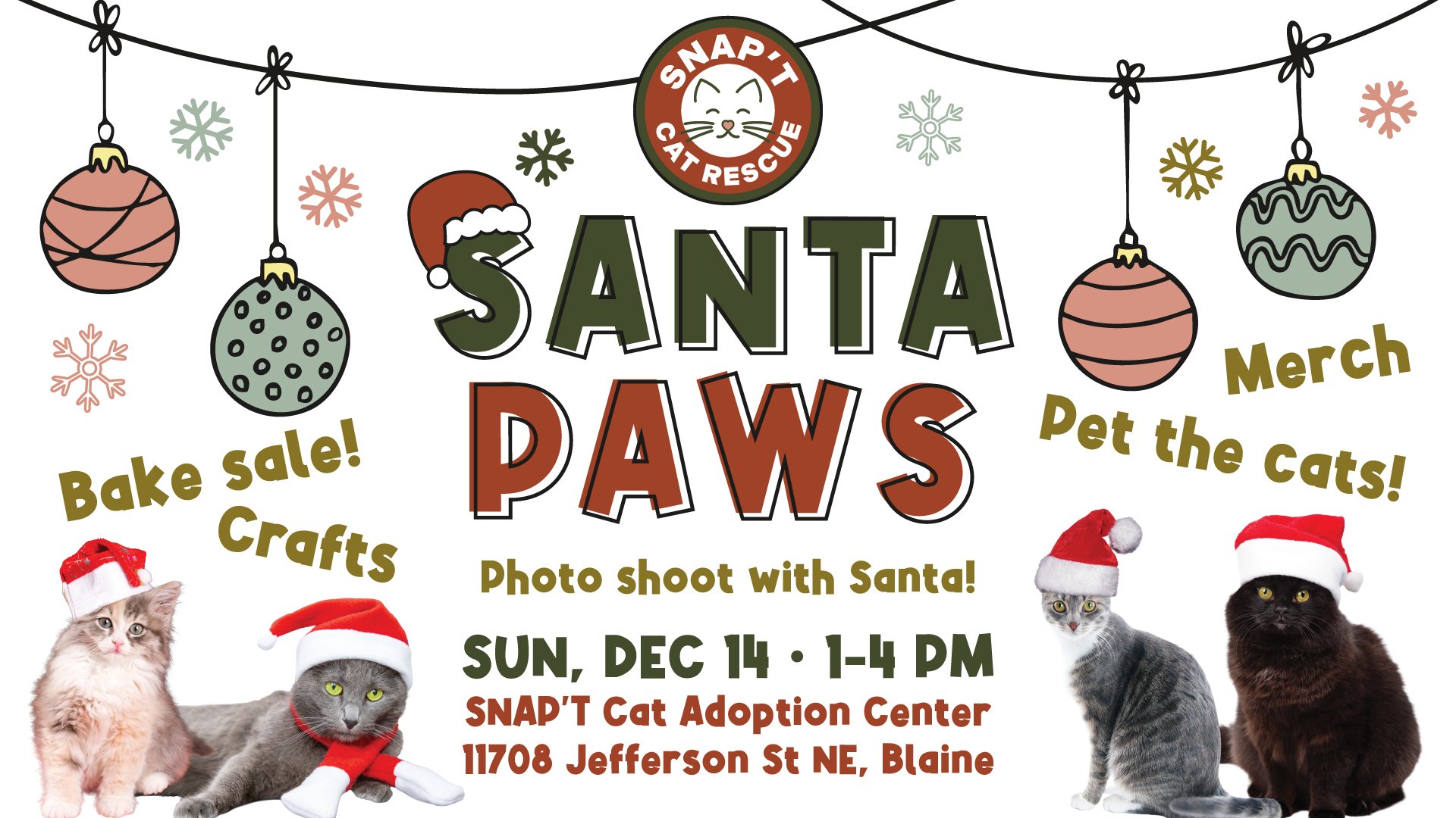 Join us for Santa Paws on Sunday, December 14 from 1–4 PM at the SNAP’T Cat Adoption Center in Blaine! Celebrate the season with a festive afternoon of bake sale treats, handmade crafts, holiday merch, and plenty of cat cuddles. Bring the whole family for a memorable photo shoot with Santa by making a donation when you check in — just be sure to reserve your spot! (Photos will be emailed to you the next day!) Whether you’re looking to support rescue cats, find a new furry friend, or simply enjoy some holiday cheer, Santa Paws is the purr-fect way to kick off the season!
